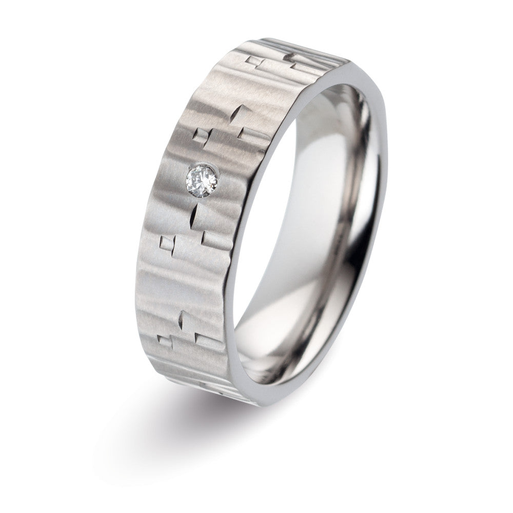 Bague de couple pour femme en titane, alliant robustesse et élégance avec sa finition texturée unique. Sertie d'un diamant brillant, elle symbolise un amour éternel et raffiné. Un choix parfait pour célébrer votre engagement avec style et modernité.