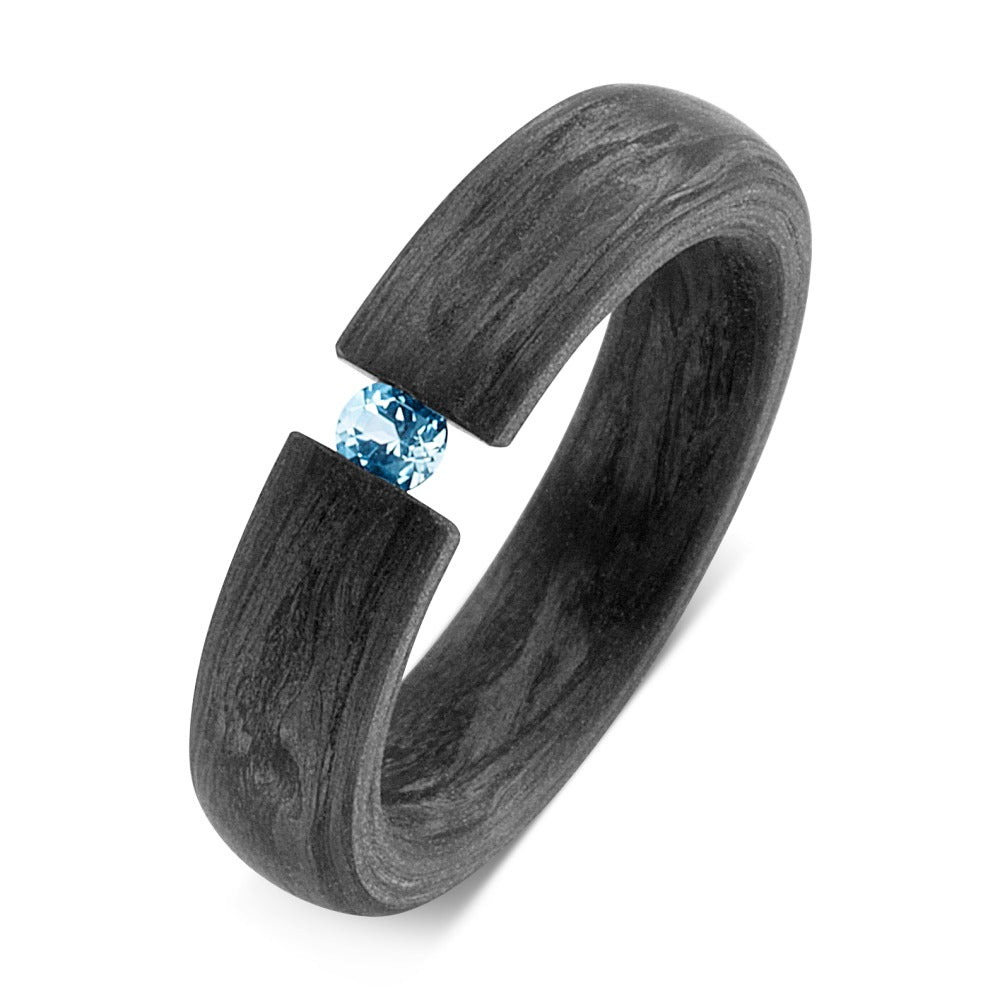 Bague féminine en carbone noir, élégante et moderne, sertie d'un topaze bleu clair au centre. Son design unique associe légèreté et robustesse pour un style contemporain et raffiné, parfait pour sublimer toutes vos tenues avec originalité et douceur.