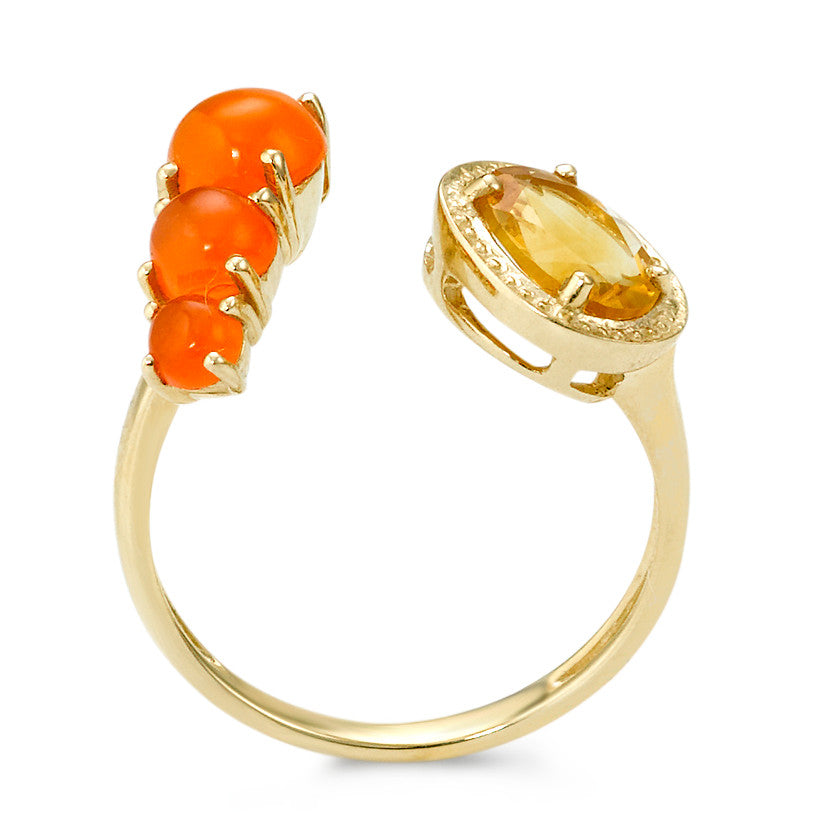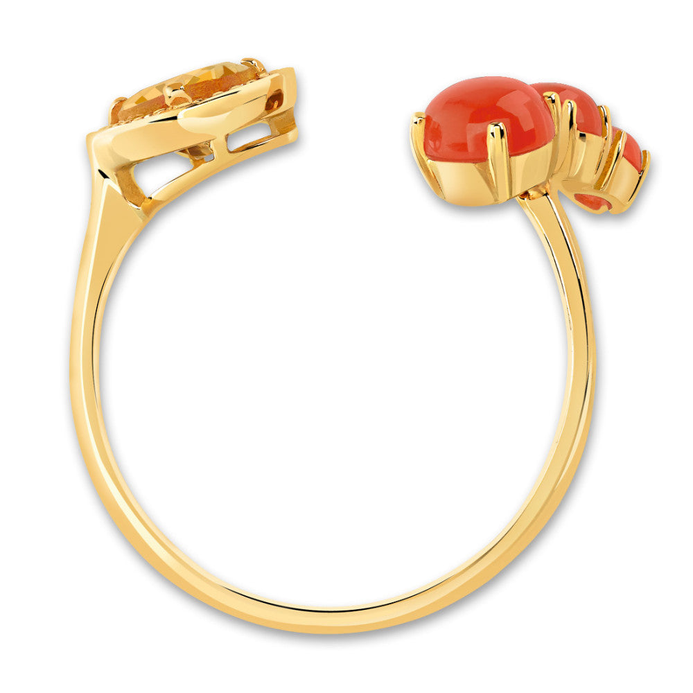Bague pour femme en or jaune 375‰ élégamment sertie d'une citrine ovale lumineuse et de trois cabochons orangés. Un design raffiné et contemporain qui apporte chaleur et éclat à votre main, parfait pour un style unique et sophistiqué au quotidien.
