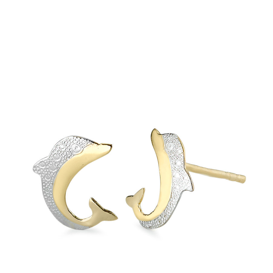 Boucles d'oreilles pour fille en or jaune 375, délicatement façonnées en forme de dauphin. Un design ludique et élégant, parfait pour les petites coquettes. Ces clous d'oreilles apportent une touche marine et raffinée à toute tenue. Idéal comme cadeau ou pour un usage quotidien.
