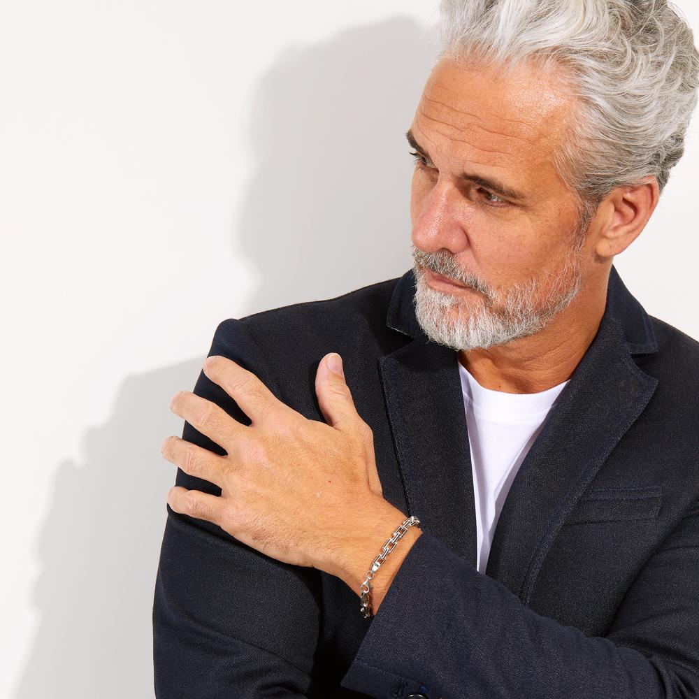 Bracelet pour homme en argent massif 925 sterling. Ce bijou élégant et robuste présente un design moderne avec des maillons rectangulaires détaillés. Parfait pour un style contemporain, il s'adapte à toutes les occasions et met en valeur votre poignet avec discrétion et charme.