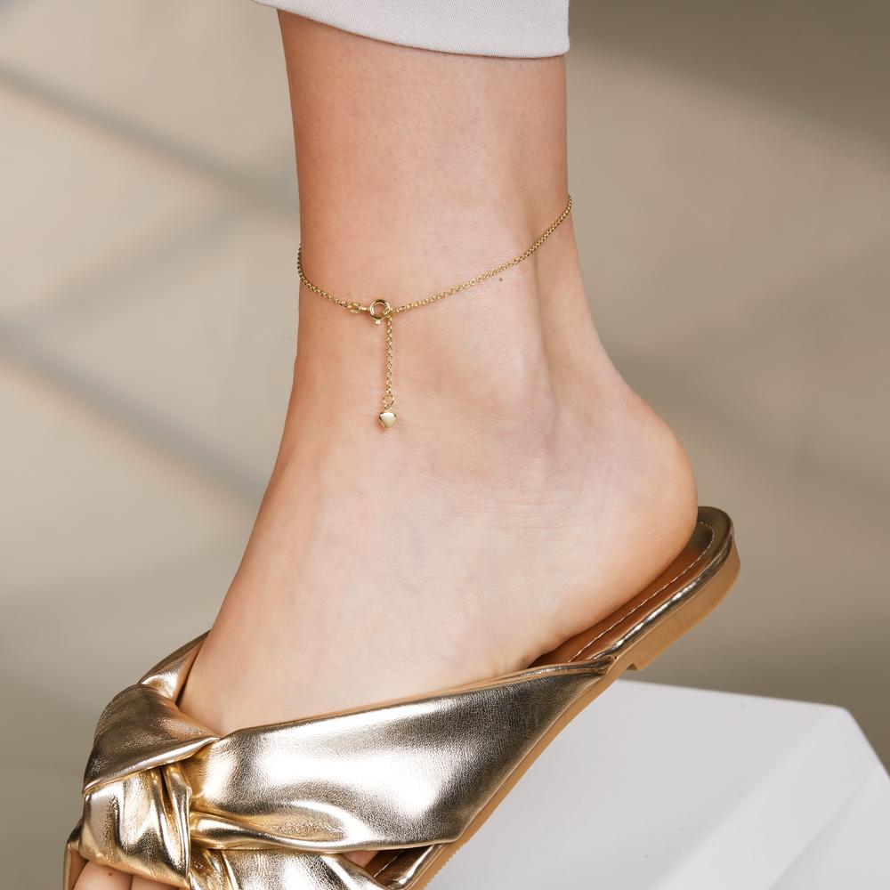 Bracelet de cheville pour femme en or jaune 585 fin, orné d'un charm en forme de cœur délicat. Élégant et discret, cet accessoire sublimera toutes vos tenues estivales avec une touche romantique et raffinée. Idéal pour un look chic et tendance.