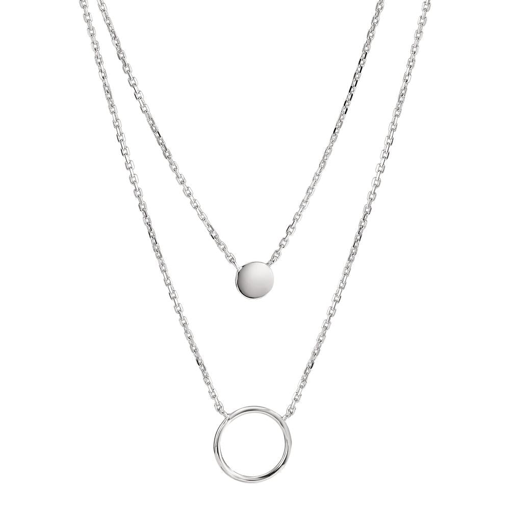 Collier pour femmes en argent élégant et moderne. Composé de deux chaînes fines, ornées d'un petit disque lisse et d'un cercle minimaliste. Parfait pour sublimer toutes vos tenues au quotidien ou lors d’occasions spéciales. Léger et raffiné, il met en valeur votre style avec simplicité.
