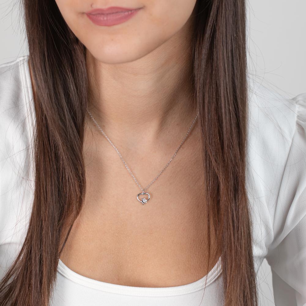 Collier élégant pour dames en argent, orné d'un pendentif en forme de cœur avec une empreinte de patte délicate au centre. Un bijou raffiné et sentimental, idéal pour les amoureuses des animaux cherchant à afficher leur affection avec style.