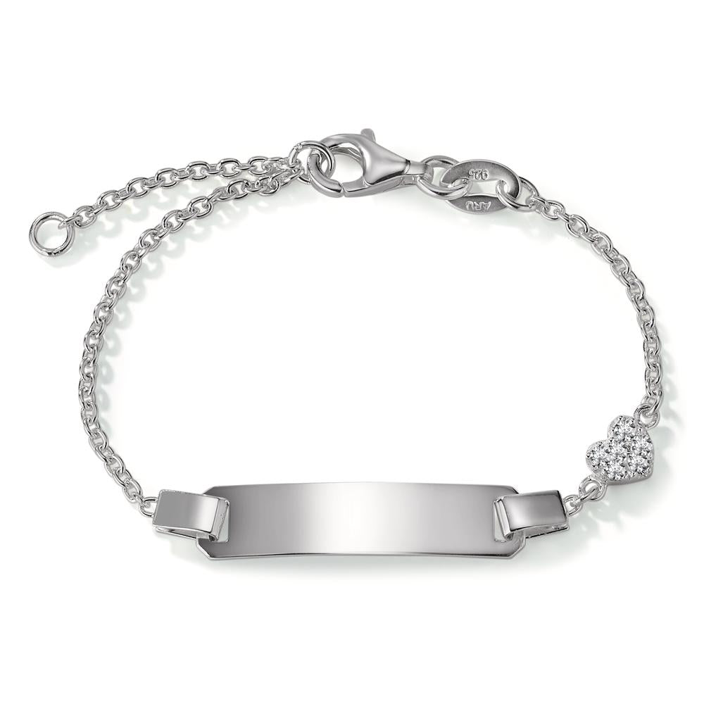 Bracelet bébé en argent massif, orné d'un petit cœur serti de zircones étincelantes. La plaque centrale permet une gravure personnalisée, rendant ce bijou unique et intime. Un cadeau précieux et élégant pour célébrer un moment inoubliable.