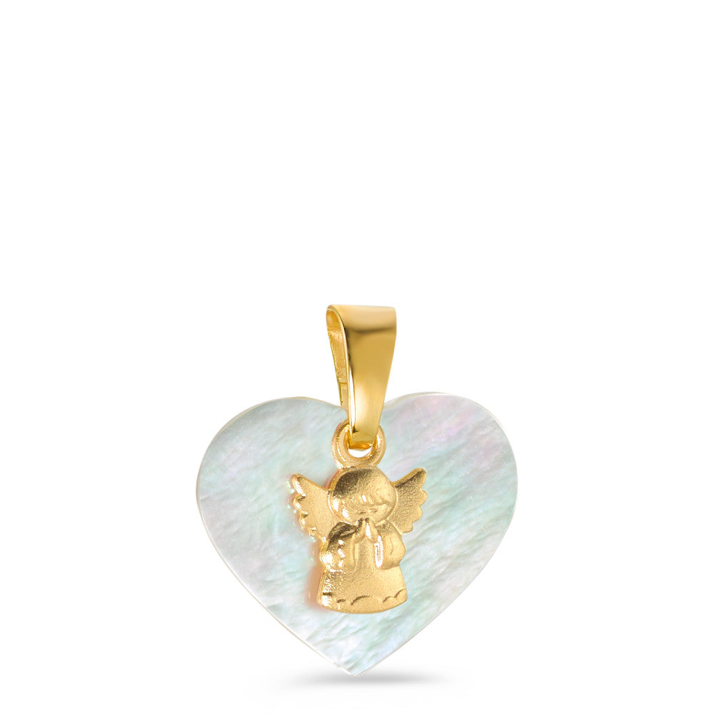 Pendentif bébé en or jaune 375, orné d’un ange protecteur délicat sur un cœur en nacre naturelle. Un bijou tendre et symbolique, parfait pour offrir en cadeau de naissance ou baptême, alliant grâce et protection pour les tout-petits. Raffinement et douceur réunis.