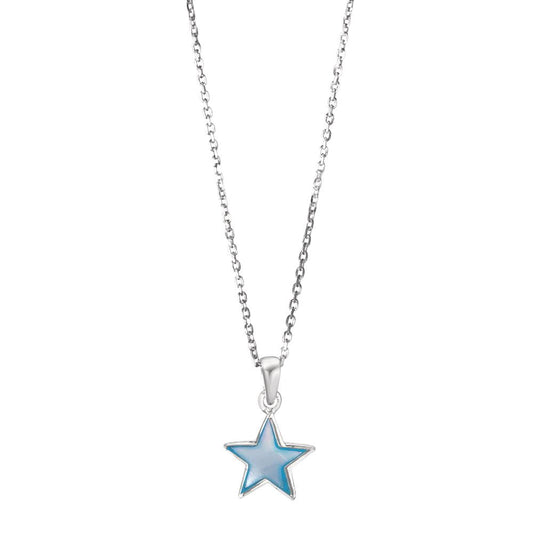 Junge Frau mit blauen Augen trägt blaue Ohrstecker, silberne Halskette mit blauem Anhänger und silbernen Ring