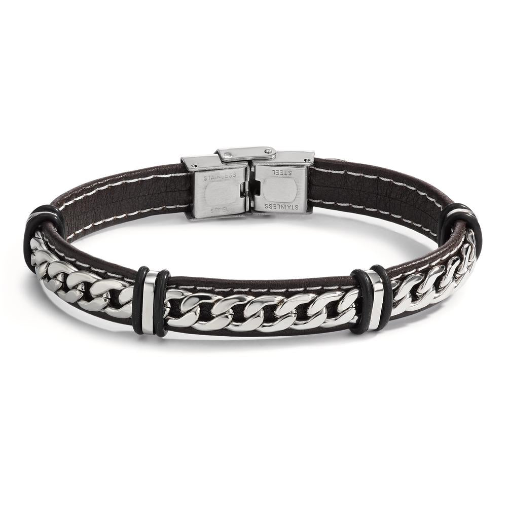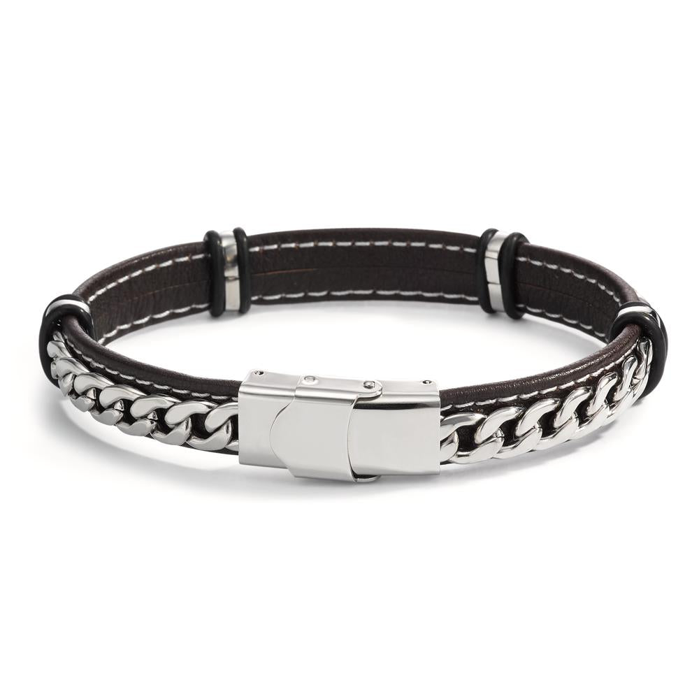 Stoere heren armband van hoogwaardig bruin leer met een stijlvolle roestvrijstalen kettingdetail. Het stevige materiaal zorgt voor duurzaamheid en een comfortabele pasvorm. Perfect voor een casual of moderne look, met een veilige en praktische sluiting. Een tijdloos accessoire voor elke man.