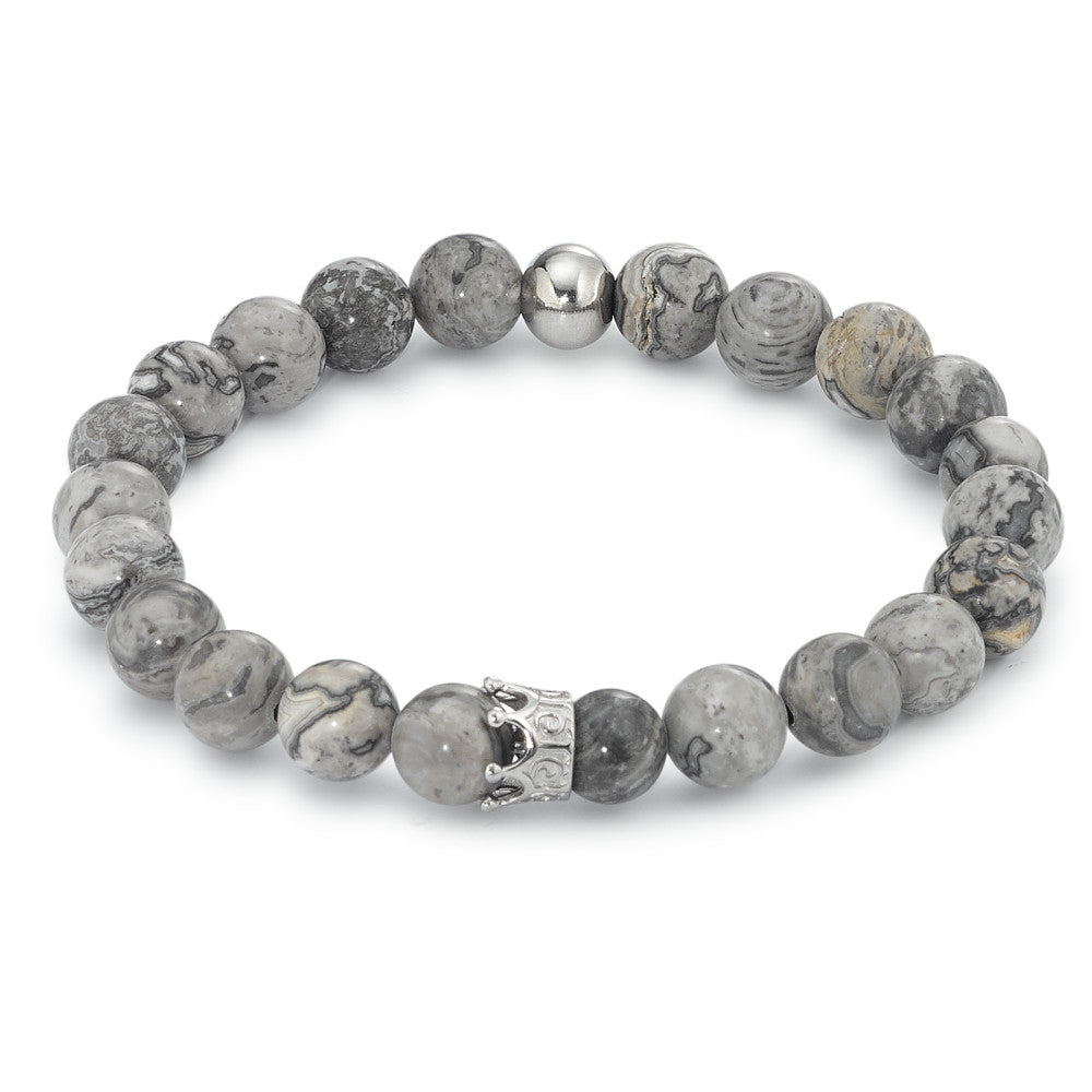 Elastische damesarmband gemaakt van robuust roestvrij staal en natuurlijk agaat. De grijze edelstenen zorgen voor een stijlvolle uitstraling, terwijl een kleine kroonbadge een elegant detail toevoegt. Perfect voor dagelijks gebruik en speciale gelegenheden.