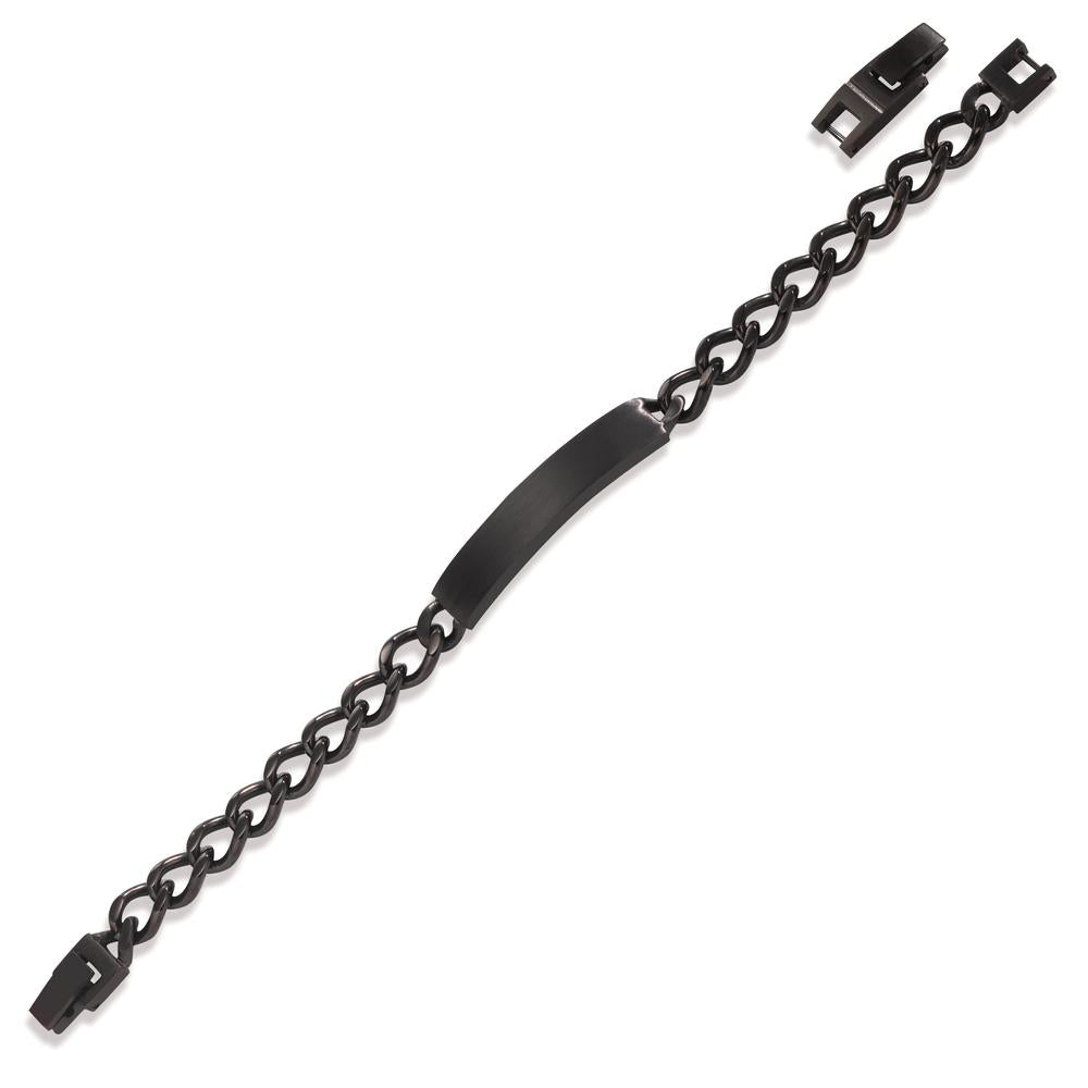Stoer herenarmband van duurzaam roestvrij staal in zwart. Dit stevige sierraad heeft een moderne look met een platte naamplaat die naar wens gegraveerd kan worden. Perfect om dagelijkse outfits stijlvol af te maken of als persoonlijk cadeau.