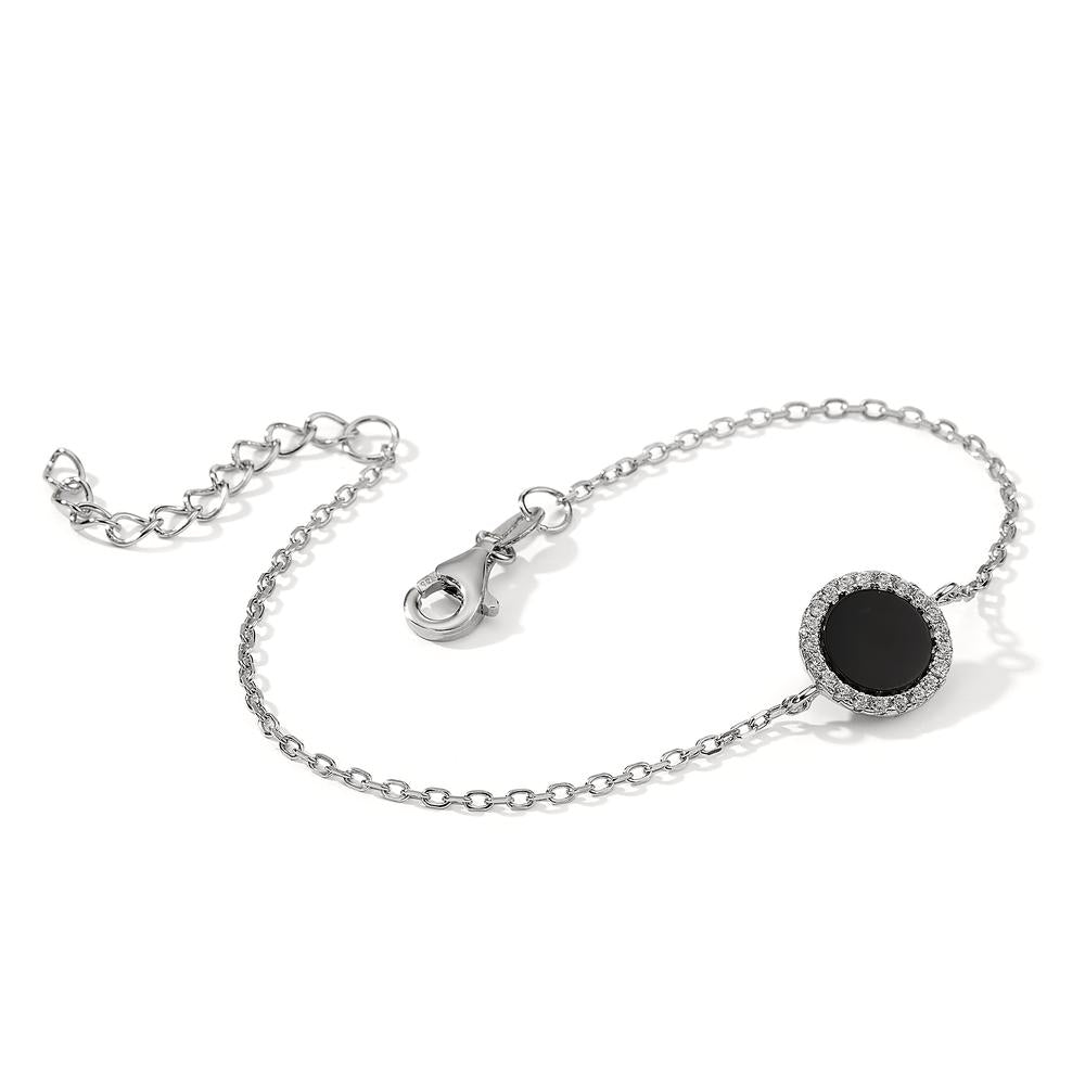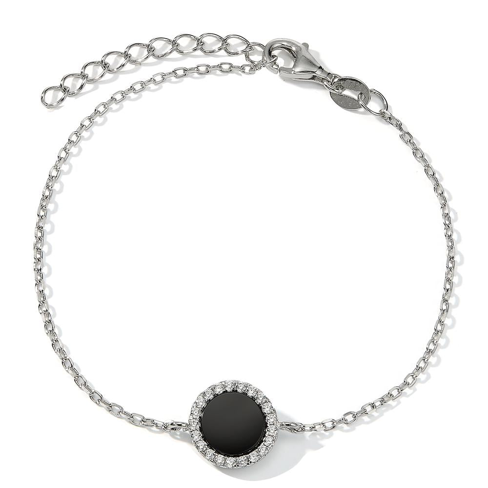 Elegant damesarmband van zilver met een ronde zwarte onyx steen, omlijst door fonkelende kristallen. Dit fijne sieraad is perfect voor elke gelegenheid en voegt een stijlvolle touch toe aan je look. Verstelbare sluiting voor een comfortabele pasvorm.