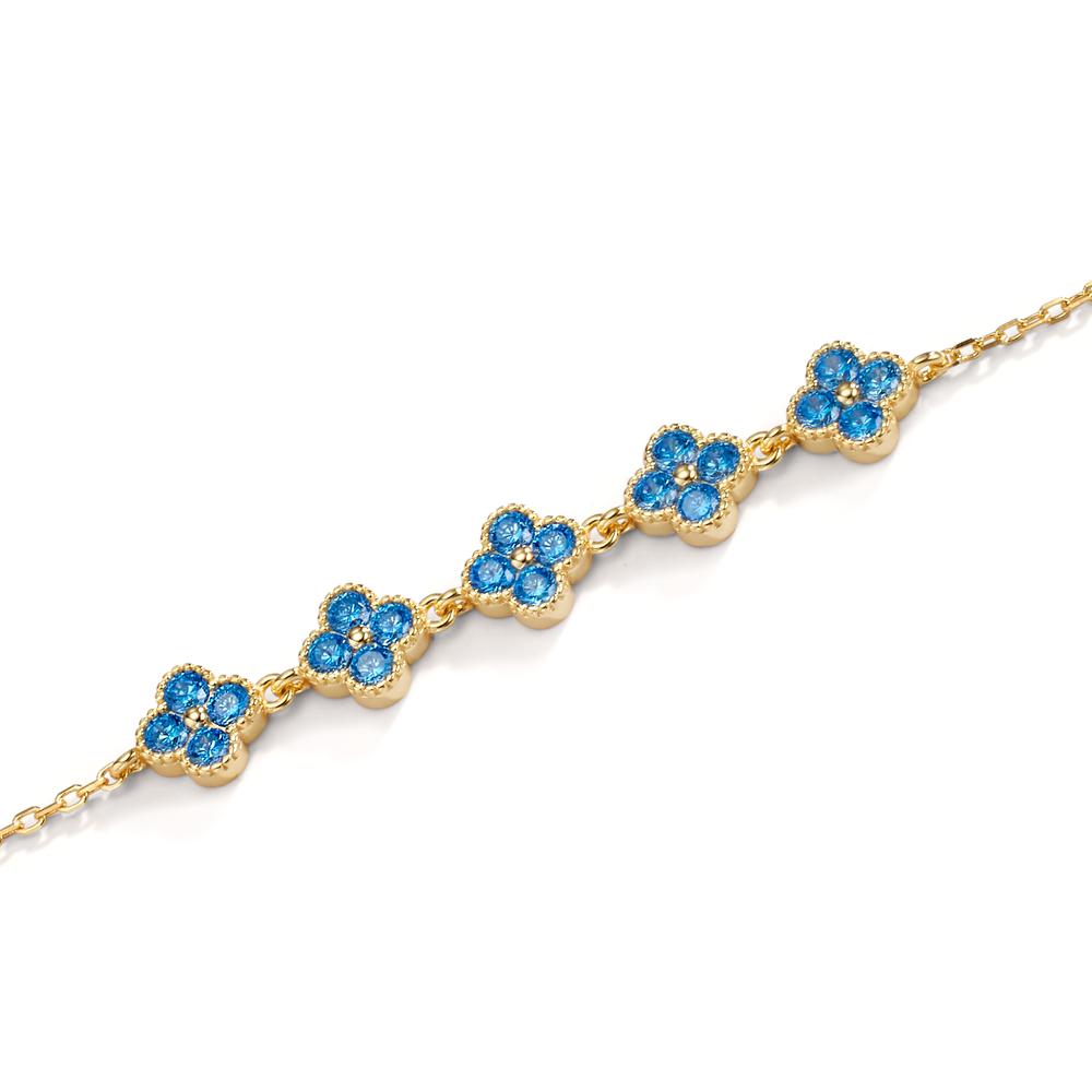 Prachtige damesarmband van hoogwaardig zilver, verguld in goud. De vijf bloemen zijn sierlijk bezet met fonkelende blauwe zirkonia’s voor een elegante uitstraling. Dit delicate en verfijnde sieraad is perfect voor elke gelegenheid en geeft elke outfit een sprankelend tintje.
