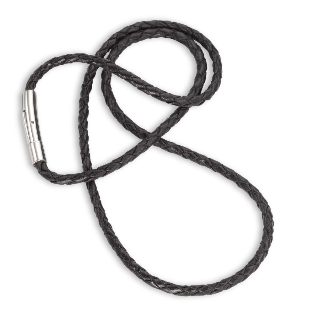 Stoer heren collier van gevlochten zwart leer met een robuuste sluiting van hoogwaardig roestvrij staal. Dit tijdloze accessoire is perfect voor dagelijks gebruik en geeft elke outfit een stijlvolle en mannelijke uitstraling. Comfortabel en duurzaam, een must-have!