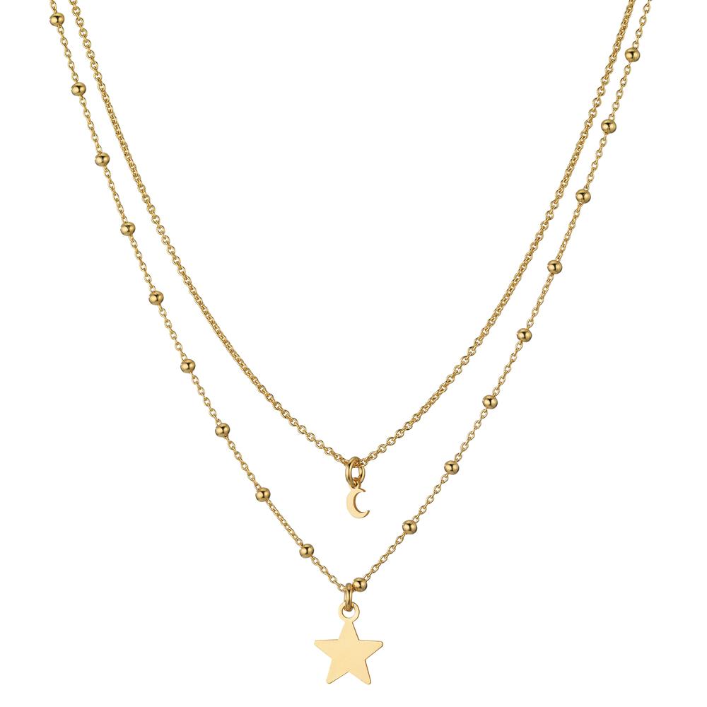 Prachtige damescollier van zilver in een stijlvolle dubbele laag. De fijne kettingen zijn versierd met een kleine ster en maan hanger, perfect voor een modieuze en elegante uitstraling. Een tijdloos sieraad dat elke outfit compleet maakt.