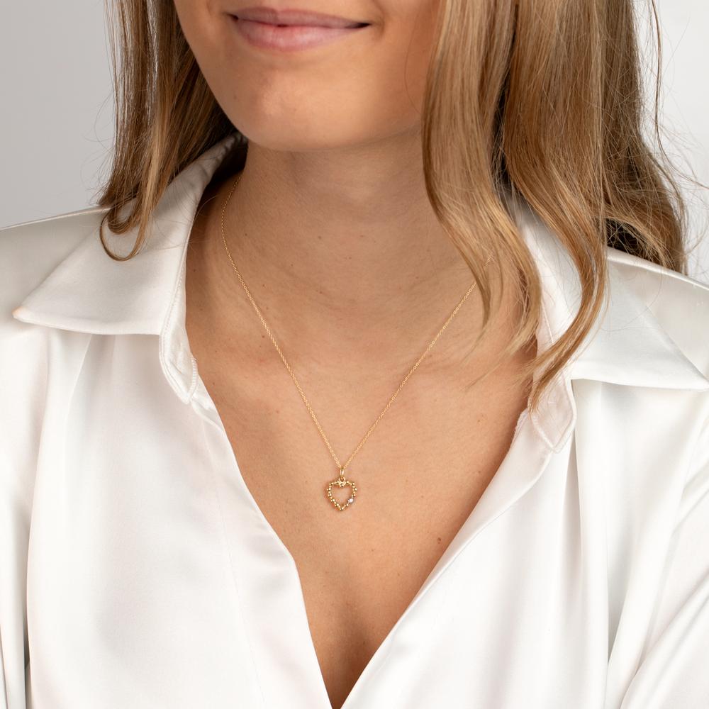 Elegant dameshanger in 375 geelgoud, gevormd als een hart van glanzende bolletjes. De schitterende zirkonia voegt een subtiele sparkle toe. Perfect als tijdloos cadeau of om jezelf te verwennen met een stijlvolle en romantische touch.