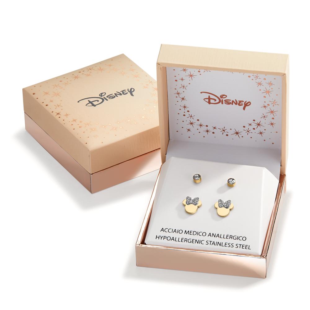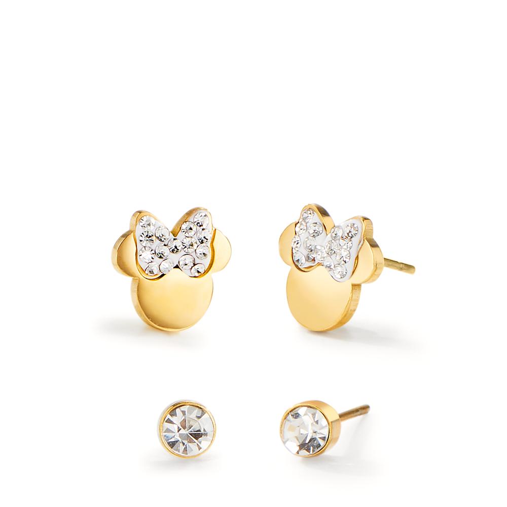 Deze kindersieraden set bevat twee paar schattige oorstekers gemaakt van roestvrij staal. Het eerste paar heeft een gouden Minnie Mouse-ontwerp met sprankelende kristallen strik, het tweede paar is eenvoudig met heldere kristallen. Perfect voor dagelijks gebruik en huidvriendelijk.