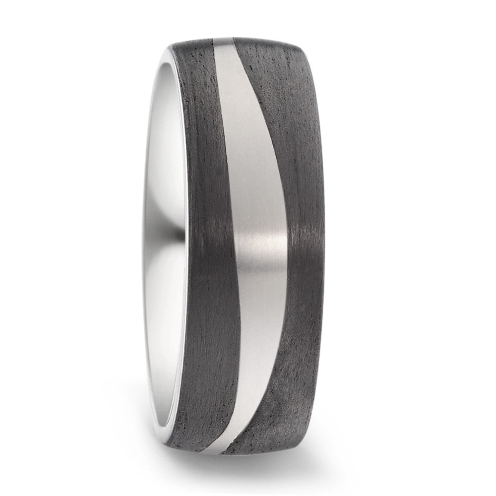 Stijlvolle partnerring van duurzaam titanium met een modieuze carbon inleg. De combinatie van het matte titanium en het donkere carbon geeft de ring een modern en tijdloos karakter. Ideaal voor koppels die houden van een unieke en robuuste uitstraling. Comfortabel en licht om te dragen.