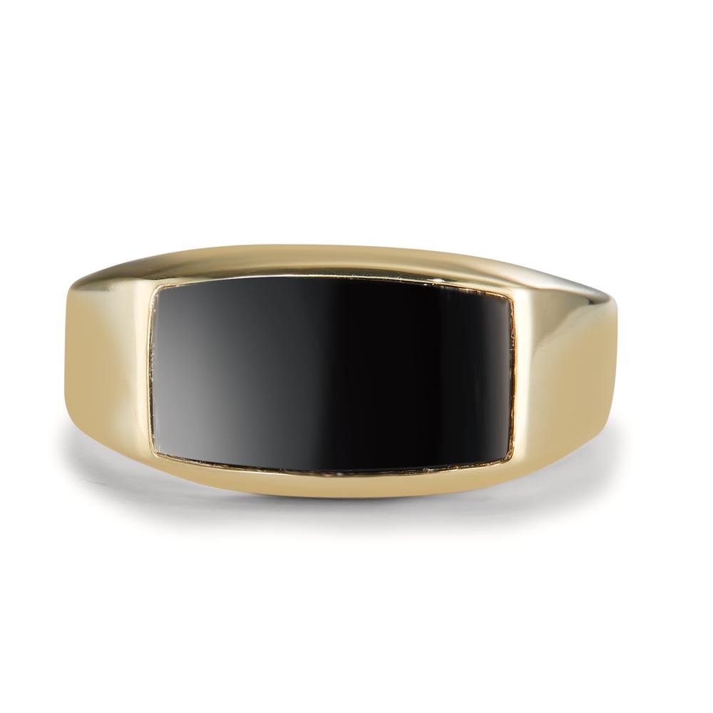 Stijlvolle herenring van 375 geelgoud, voorzien van een glanzende onyx steen. Deze klassieke ring combineert tijdloos design met hoogwaardige materialen en is perfect voor elke gelegenheid. Een elegant accessoire voor mannen die houden van verfijnde details.