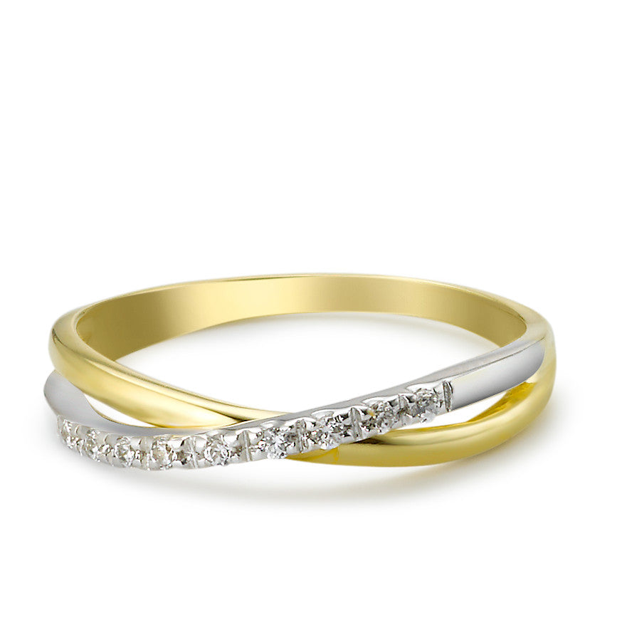 Prachtige damesring van 750 geelgoud en witgoud, met een elegante gedraaide vorm. De ring is versierd met fonkelende zirkonia steentjes voor een subtiele sparkle. Tijdloos en stijlvol, perfect voor elke gelegenheid en makkelijk te combineren met andere sieraden.