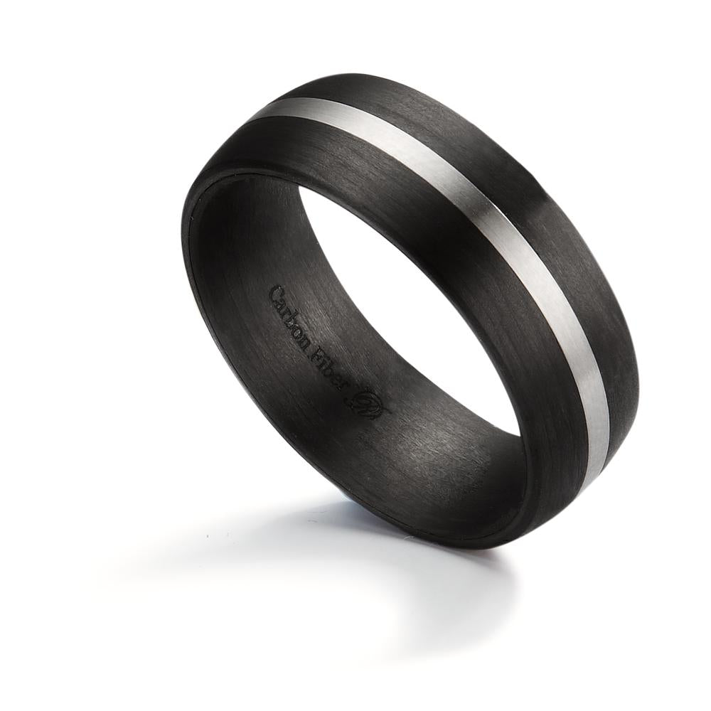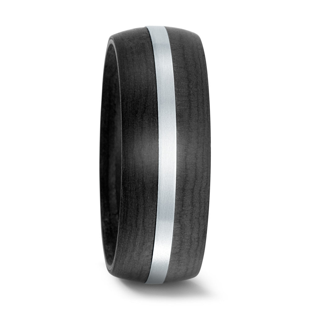 Stoere herenring gemaakt van hoogwaardig carbon en duurzaam roestvrij staal. De combinatie van matzwart carbon met een zilverkleurige streep geeft een moderne en elegante uitstraling. Lichtgewicht, krasbestendig en perfect voor dagelijks dragen. Een tijdloze must-have accessoire.