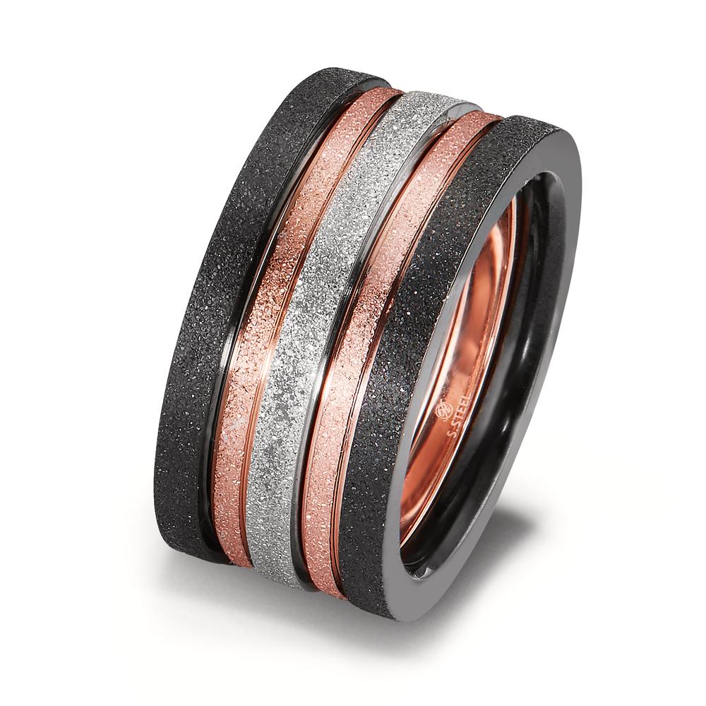 Stijlvolle damesring van hoogwaardig roestvrij staal met een moderne combinatie van zwart, zilver en roségoud. De ring heeft een matte en glanzende afwerking die een uniek en elegant accent geeft. Perfect voor dagelijks gebruik en speciale gelegenheden. Duurzaam en huidvriendelijk.