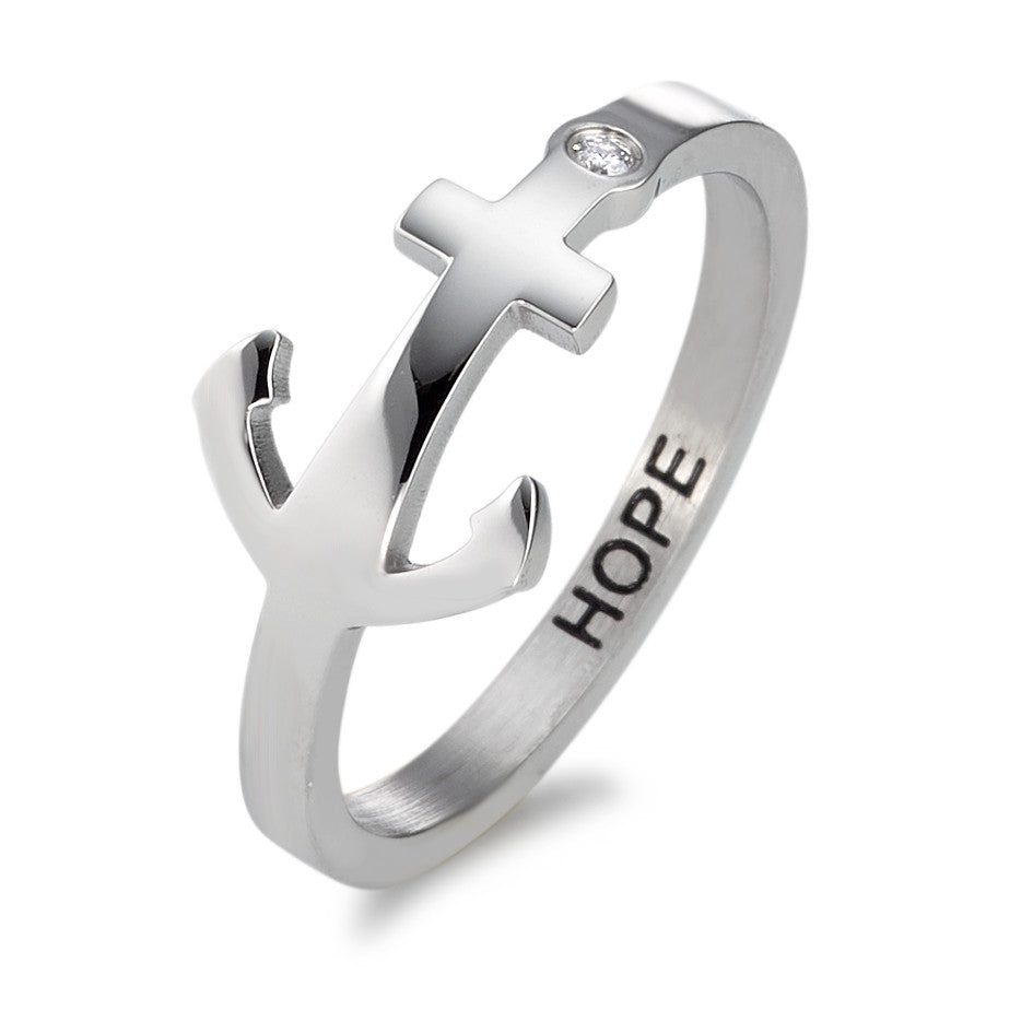 Stijlvolle damesring van roestvrij staal in ankerdesign. De ring heeft een glanzende afwerking met een klein helder steentje en is binnenin gegraveerd met het woord "HOPE". Een perfect accessoire voor wie elegantie en symboliek wil combineren. Duurzaam en modern.