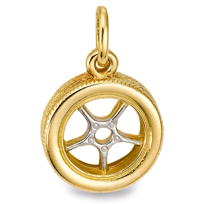 Stylischer Herren-Anhänger in Form eines Autoreifens aus hochwertigem 375er Gelbgold mit silberner Felge. Ein einzigartiges Schmuckstück für Autoenthusiasten, das täglich getragen werden kann und jedem Outfit eine besondere Note verleiht. Perfekt als Geschenk oder für den eigenen Stil.