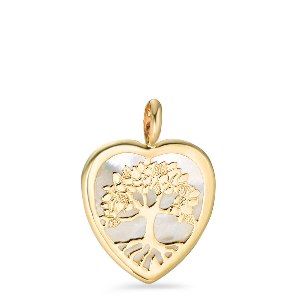 Eleganter Damenanhänger aus 375er Gelbgold in Herzform mit filigranem Lebensbaum-Design. Das schimmernde Perlmutt im Hintergrund verleiht dem Schmuckstück eine edle und natürliche Ausstrahlung. Perfekt als besonderes Geschenk oder für den täglichen Stil.