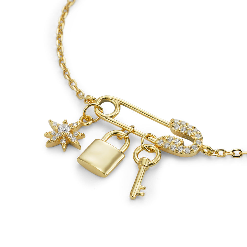 Dieses filigrane Damenarmband aus edlem Silber besticht durch funkelnde Zirkonia-Steine. Der Sicherheitsspangen-Anhänger mit Stern, Schloss und Schlüssel verleiht dem Schmuckstück einen verspielten, modernen Look – ein perfektes Accessoire für jeden Anlass.