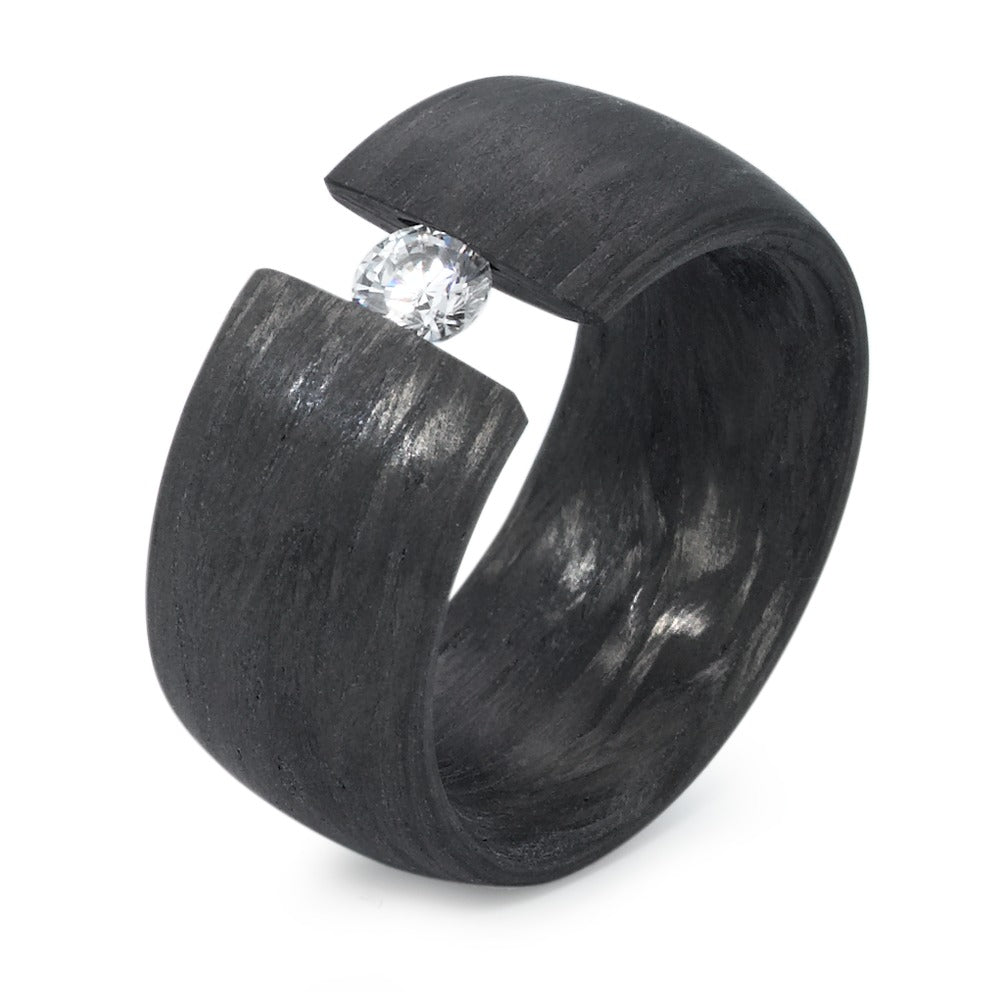 Moderner Damen-Fingerring aus edlem Carbon mit einer eleganten Zirkonia-Steinfassung. Das innovative Design vereint Leichtigkeit und Stil und setzt mit dem funkelnden Zirkonia einen strahlenden Akzent. Perfekt für den Alltag und besondere Anlässe.
