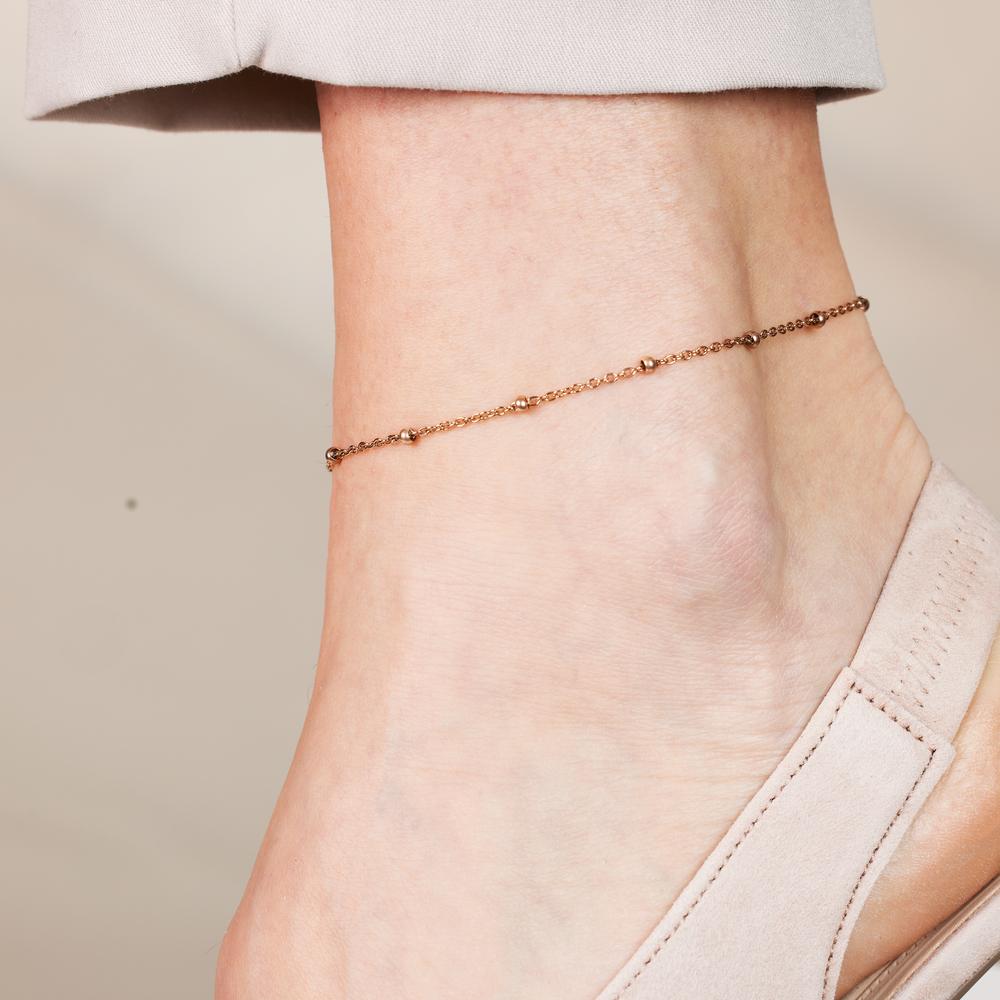 Elegantes Damen Fußkettchen aus hochwertigem Edelstahl in edlem Roségold. Feine Kettenglieder verziert mit kleinen Kügelchen sorgen für einen zarten, femininen Look. Verstellbare Länge für perfekten Sitz. Ideal für jeden Tag und besondere Anlässe.