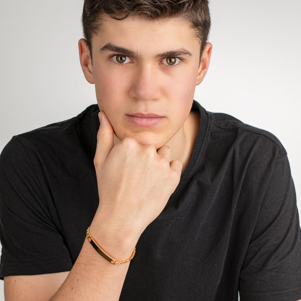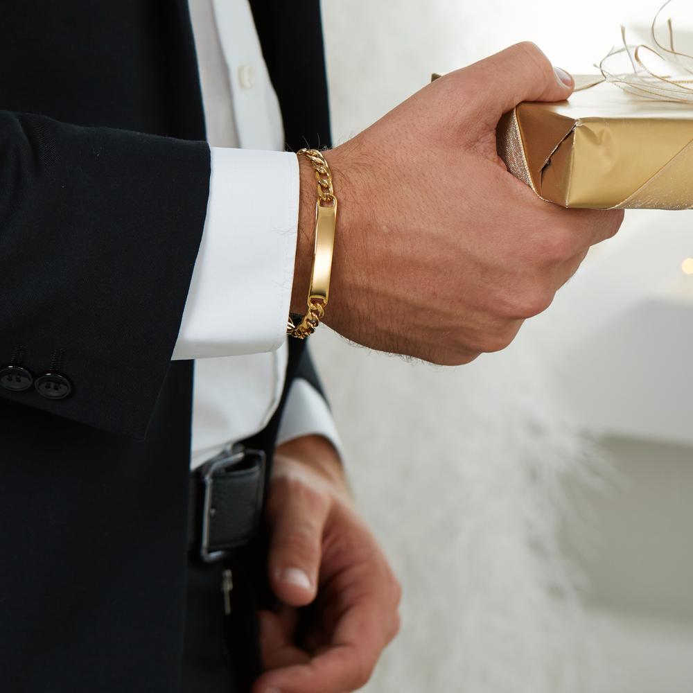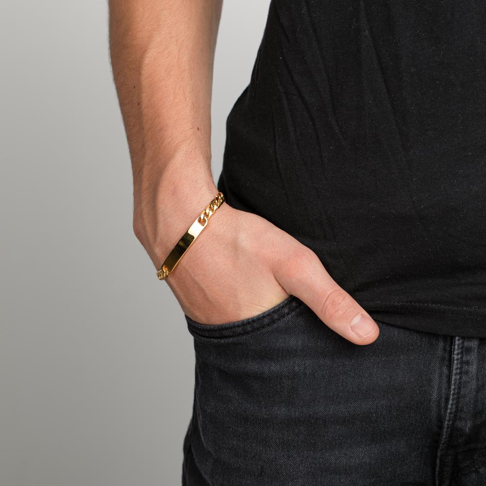 Stilvolles Herren-Armband aus hochwertigem Edelstahl mit personalisierbarer Gravurplatte. Das robuste Band besticht durch sein edles Design und ist ein perfektes Accessoire für jeden Anlass. Langlebig, elegant und individuell – ein ideales Geschenk für Männer.