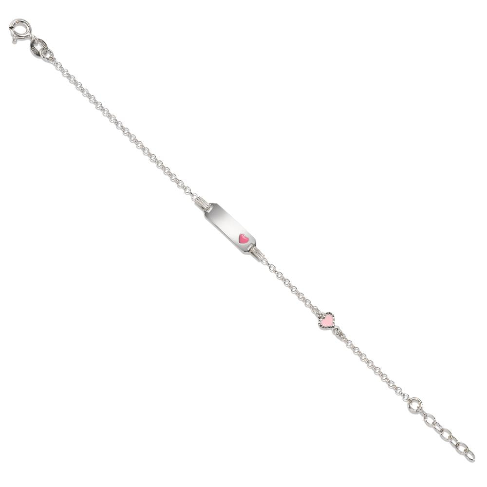 Feines Silber-Armband für Mädchen mit zarter Herz-Gravur in Pink. Die glänzende Plakette bietet Platz für eine persönliche Gravur und wird ergänzt durch ein kleines emailliertes Herz als niedliches Highlight. Verstellbare Länge für perfekten Sitz am Handgelenk.