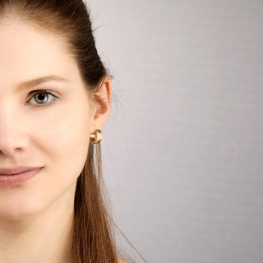 Elegante Damen Klappcreolen aus hochwertigem, goldfarbenem Edelstahl. Verziert mit funkelnden Zirkonia-Steinen, die für ein strahlendes Finish sorgen. Zeitloses Design, ideal für jeden Anlass, das Ohrläppchen stilvoll zu betonen. Hypoallergen und langlebig für Ihren Alltagskomfort.