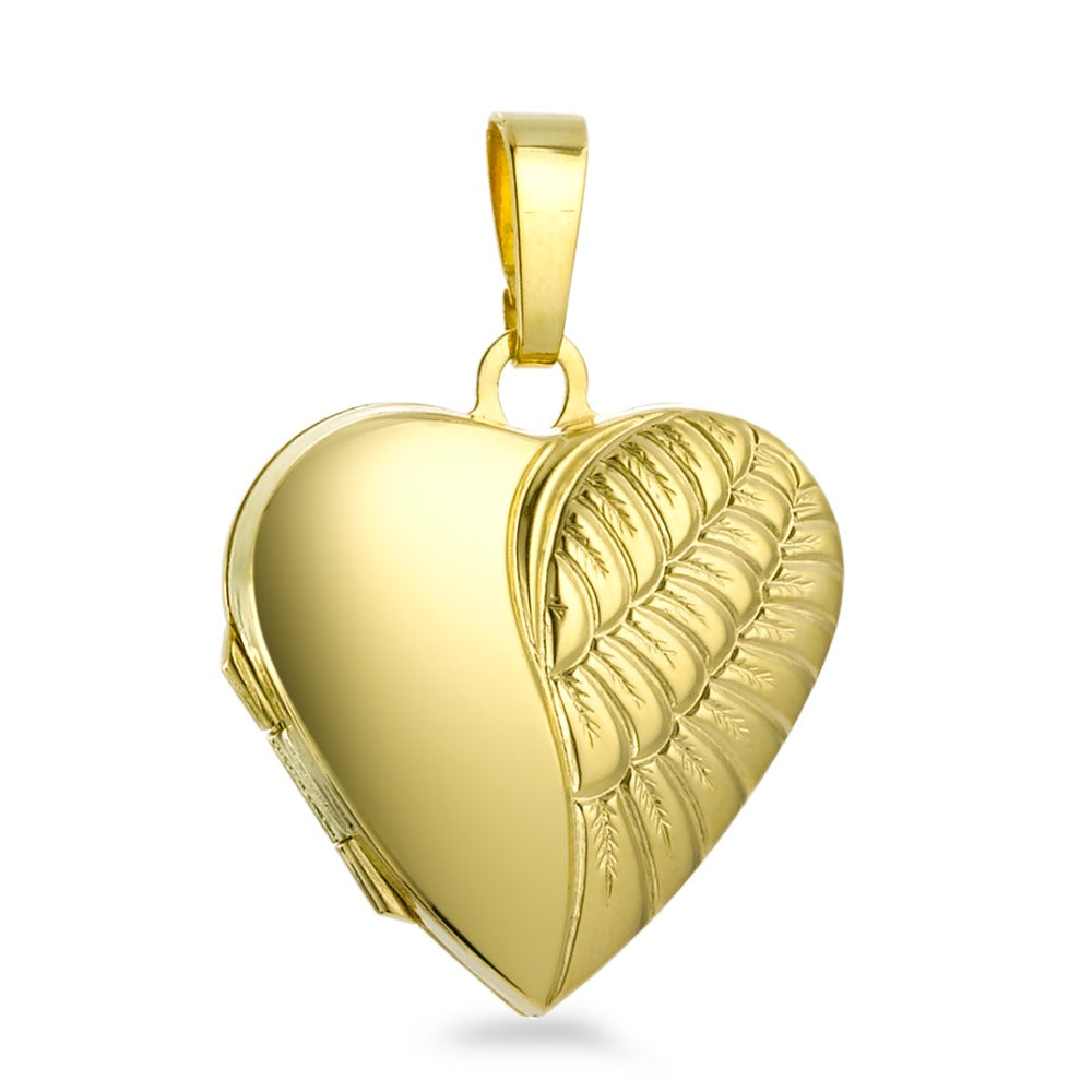 Edles Damen Medaillon aus 375er Gelbgold in Herzform mit filigranem Flügel-Relief. Perfekt geeignet, um kleine Erinnerungen stilvoll zu bewahren. Feines Schmuckstück, das sich elegant zu jedem Anlass tragen lässt und zeitlose Schönheit verkörpert.