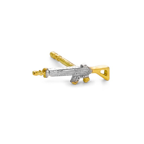 Stylischer Herren-Ohrstecker aus hochwertigem 750er Gelbgold, detailreich gestaltet als Sturmgewehr. Ein auffälliges Accessoire für selbstbewusste Männer, die Statement-Schmuck mit besonderem Design schätzen. Einzelstück – ideal als Geschenk oder für den eigenen Look.