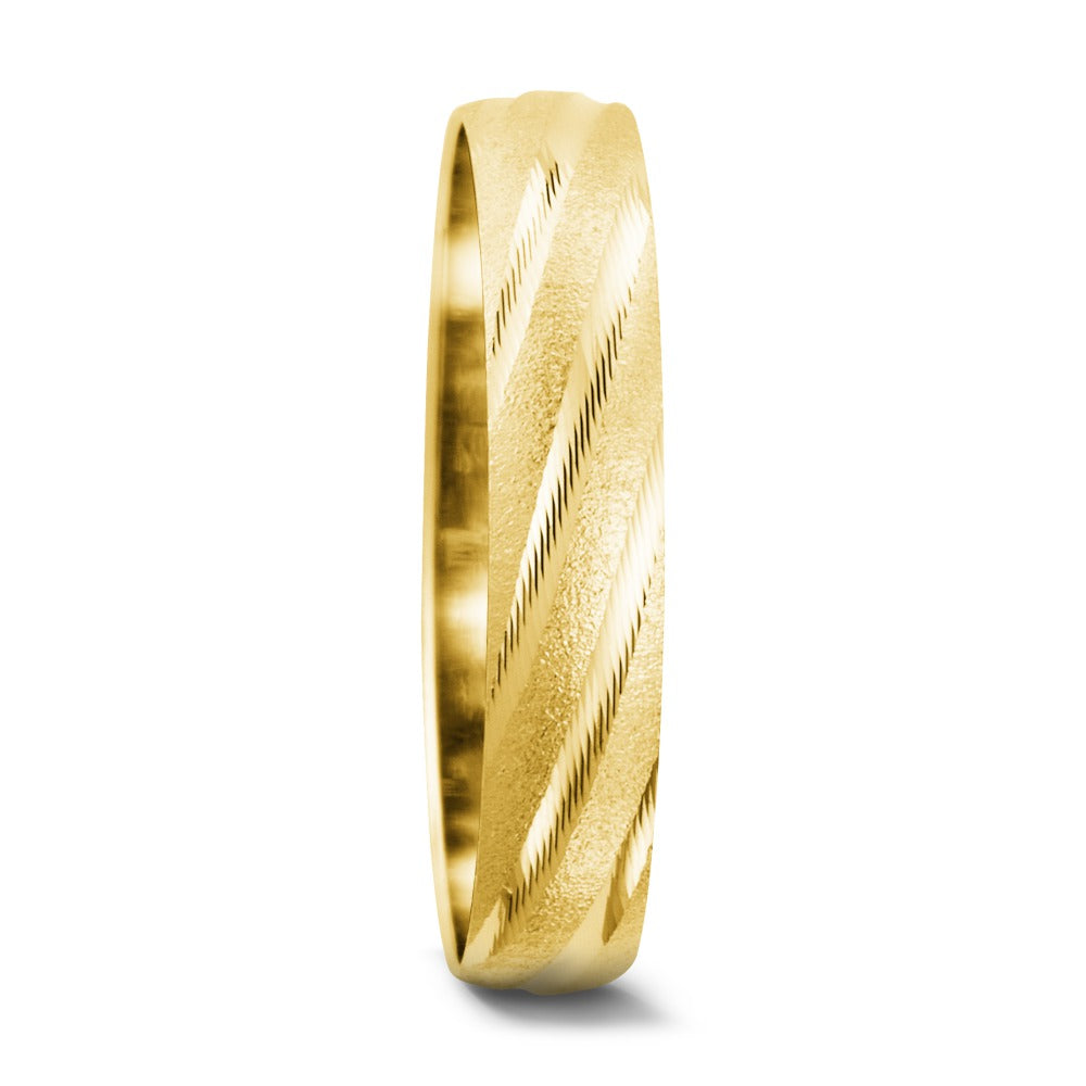 Eleganter Partnerring aus hochwertigem 375er Gelbgold mit stilvoller, diagonal strukturierter Oberfläche. Dieser zeitlose Ring verbindet edles Design mit angenehmem Tragekomfort und ist das perfekte Symbol für Ihre Verbundenheit. Ideal als Zeichen für eine besondere Partnerschaft.