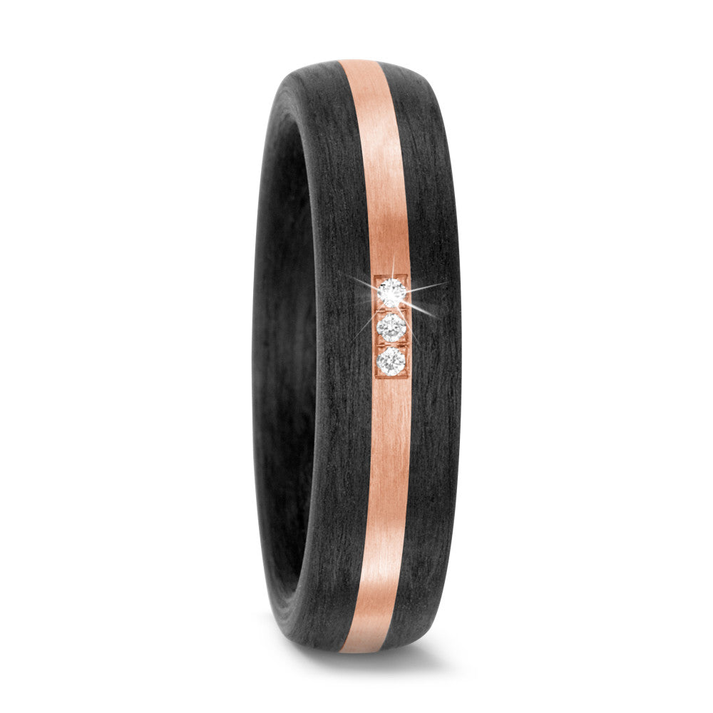 Eleganter Damen-Partnerring aus 585er Roségold und schwarzem Carbon. Die Kombination aus warmem Roségold mit dem modernen Carbon sorgt für einen einzigartigen Look. Drei funkelnde Diamanten setzen glanzvolle Akzente und machen den Ring zum perfekten Symbol für Ihre Verbundenheit.