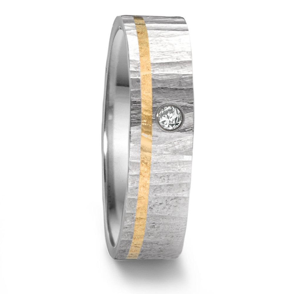 Moderner Damen-Partnerring aus robustem Edelstahl mit feiner, 750 Gelbgold-Einlage. Ein funkelnder Diamant setzt einen eleganten Akzent. Das Design verbindet Langlebigkeit mit zeitloser Schönheit – perfekt für die Liebeserklärung, die ein Leben lang hält.