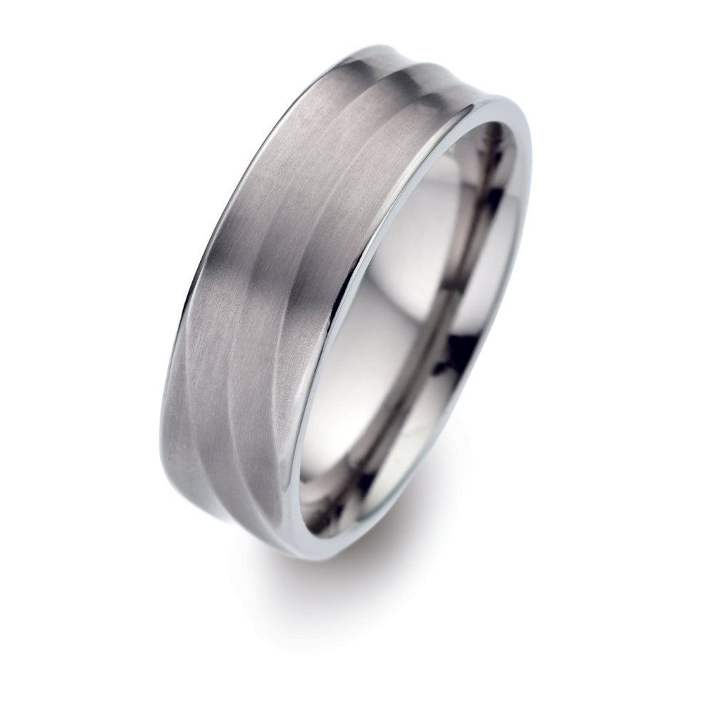 Moderner Herren Partnerring aus hochwertigem Titan, der für seine Leichtigkeit und Robustheit bekannt ist. Das matt gebürstete Finish mit dezentem Wellenmuster verleiht dem Ring einen zeitlosen, maskulinen Look – ideal für den stilbewussten Mann. Perfekt als Symbol für Verbundenheit.