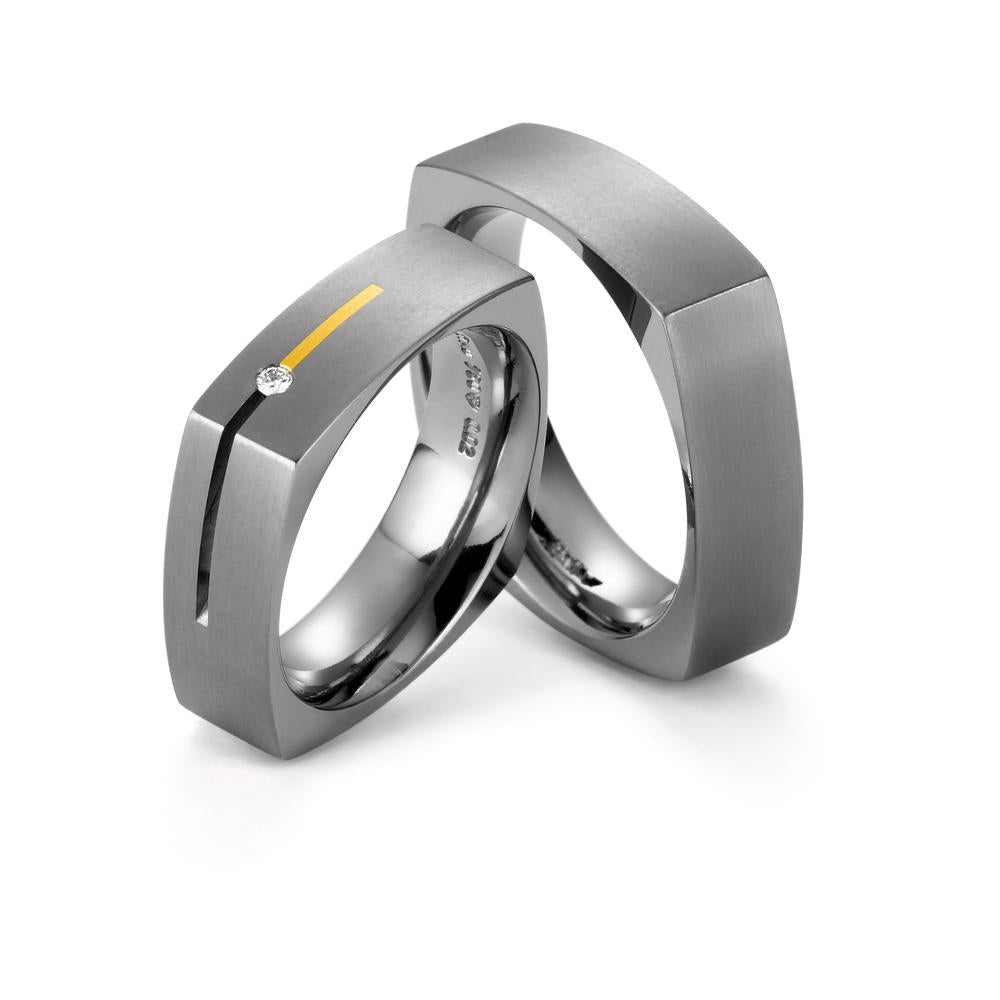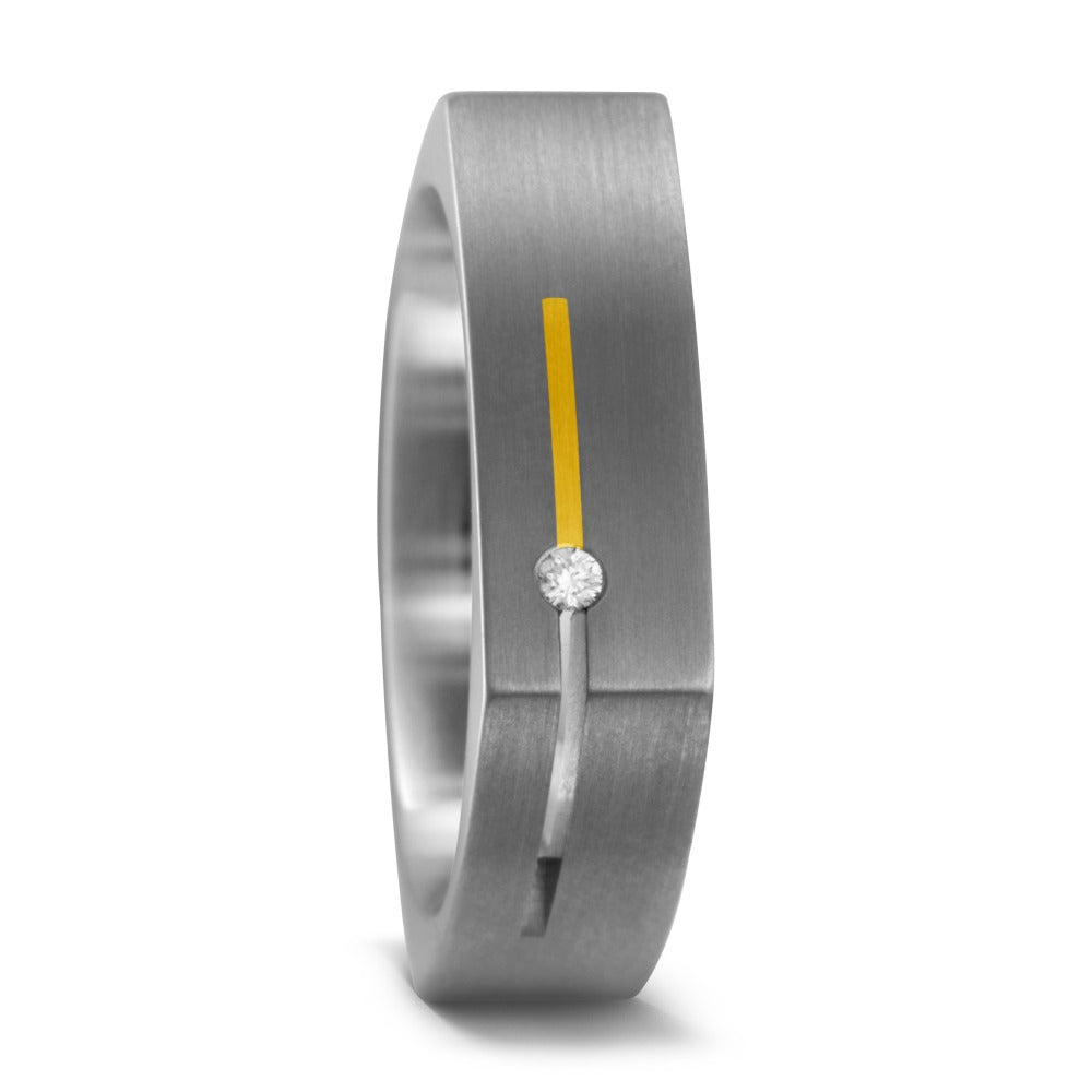 Eleganter Damen-Partnerring aus robustem Titan mit einem feinen Einsatz aus 750er Gelbgold. Ein funkelnder Diamant setzt einen glänzenden Akzent und verleiht dem Ring zeitlose Schönheit und besondere Eleganz – das perfekte Symbol für Ihre Verbundenheit.