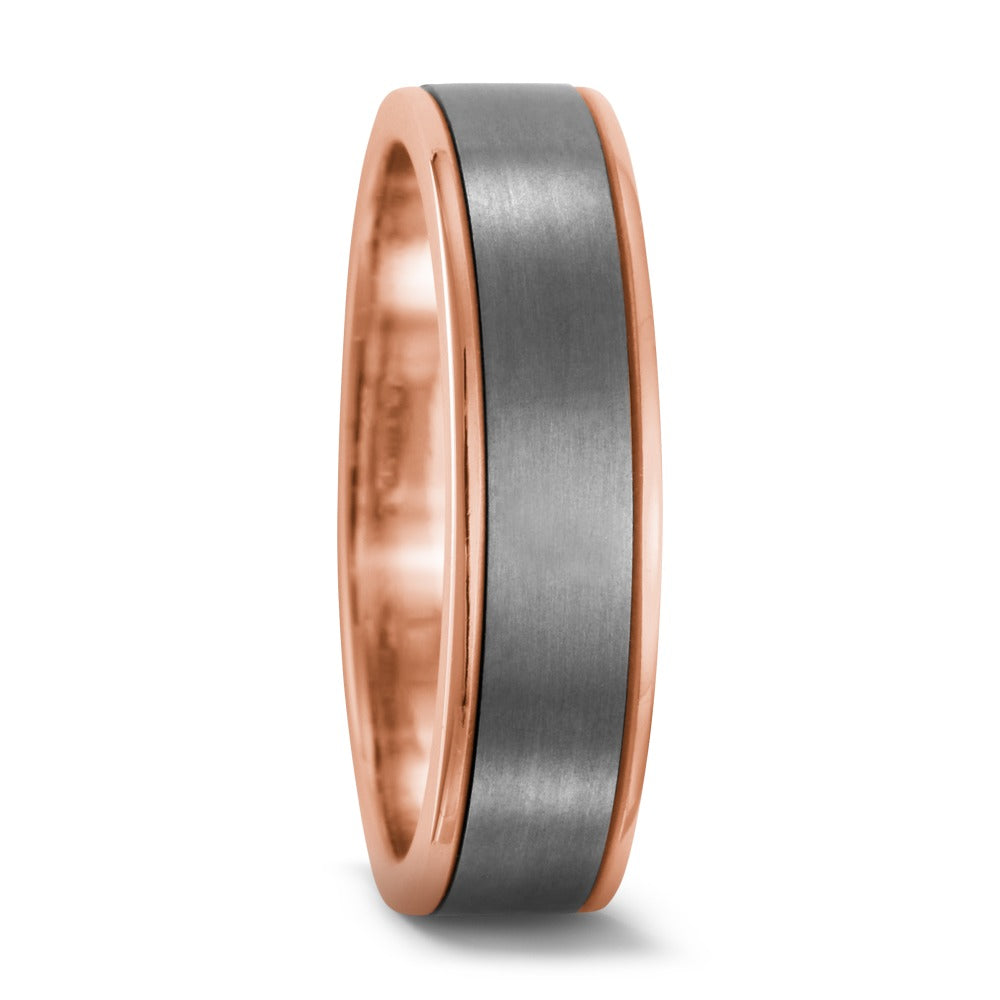 Moderner Partnerring aus robustem Titan mit eleganten Applikationen aus 750er Rotgold. Dieses edle Schmuckstück vereint zeitlose Ästhetik und außergewöhnliche Widerstandsfähigkeit – perfekt für Paare, die Stil und Beständigkeit schätzen.