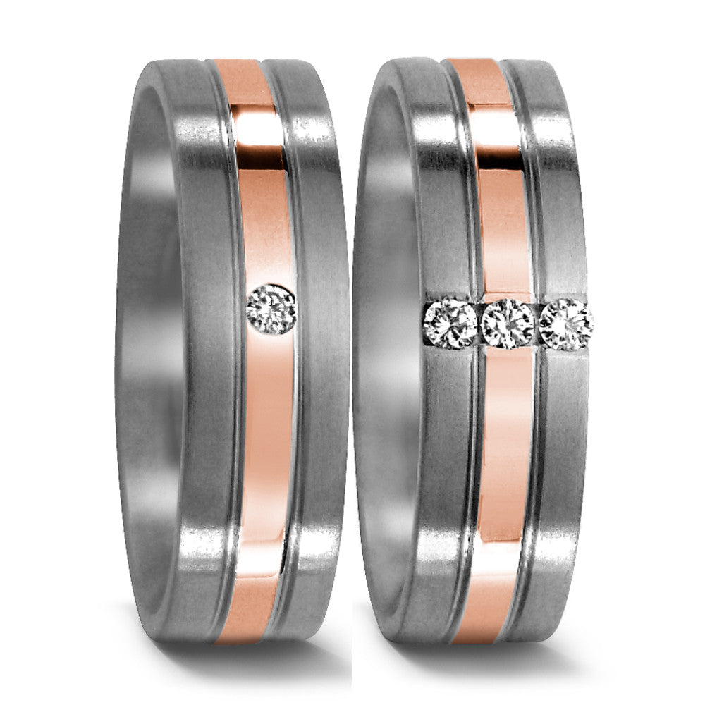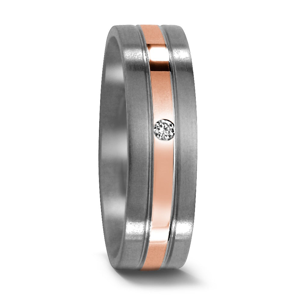 Eleganter Damen-Partnerring aus robustem Titan mit einem edlen Mittelstreifen aus 750er Rotgold. Ein funkelnder Diamant verleiht dem Ring zeitlose Schönheit und Exklusivität. Perfekt für besondere Momente und als Symbol der Verbundenheit.