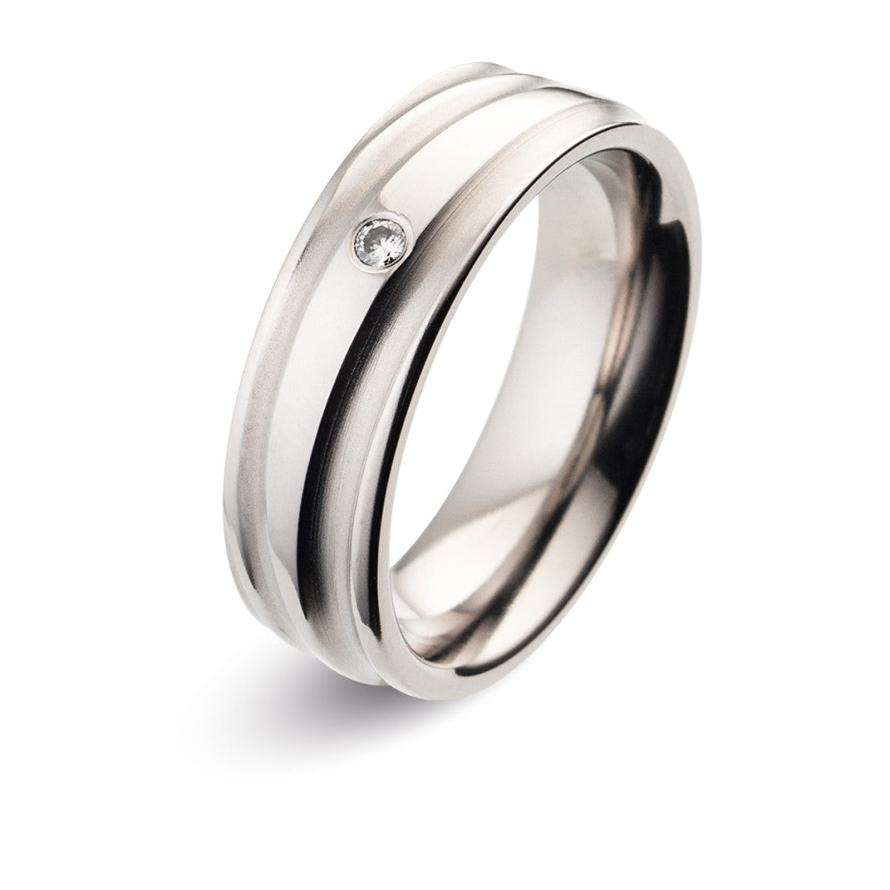 Eleganter Damen-Partnerring aus robustem Titan mit einer markanten, modernen Struktur. Veredelt wird der Ring durch einen funkelnden Diamanten, der dem Schmuckstück eine zeitlose und edle Ausstrahlung verleiht. Perfekt für besondere Momente zu zweit.