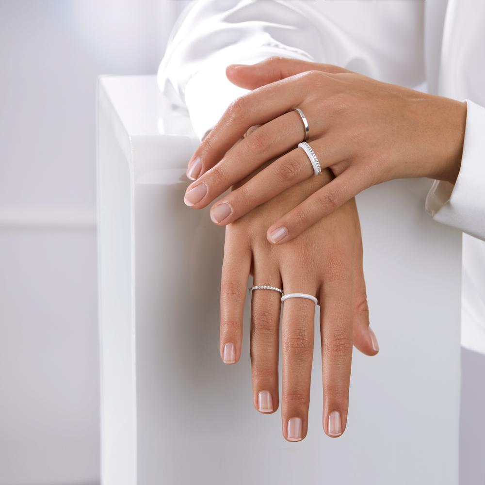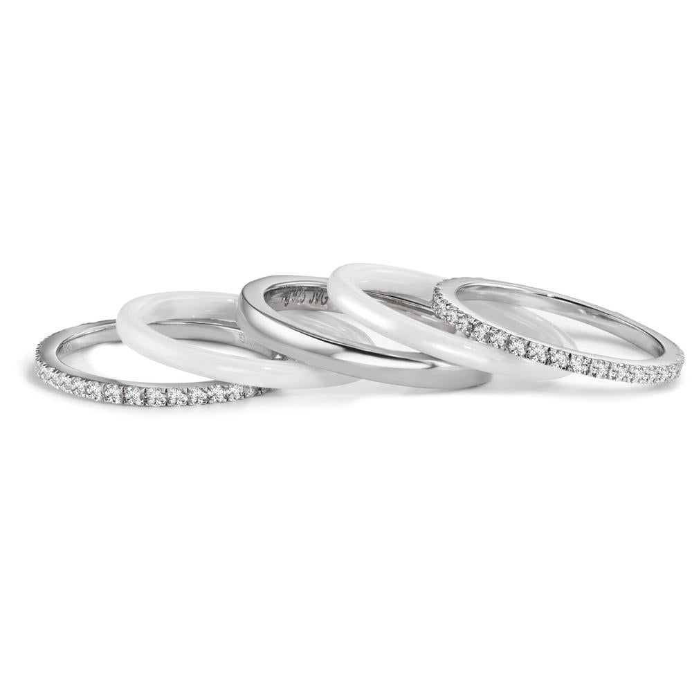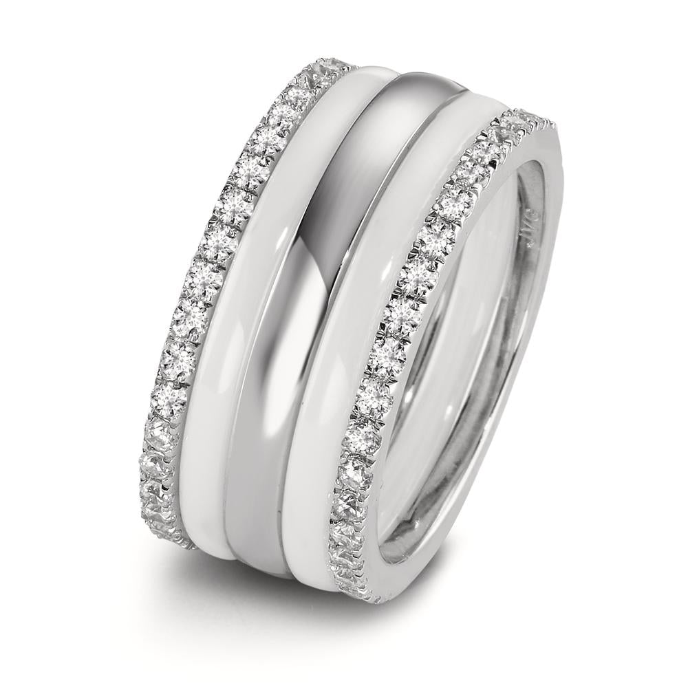 Moderner Damen Fingerring aus hochwertigem Silber mit weißer Keramik-Inlay. Die beiden äußeren Reihen sind mit funkelnden Zirkonia besetzt, die dem Ring einen eleganten Glanz verleihen. Ein stilvolles Accessoire, das jeden Look perfekt ergänzt.