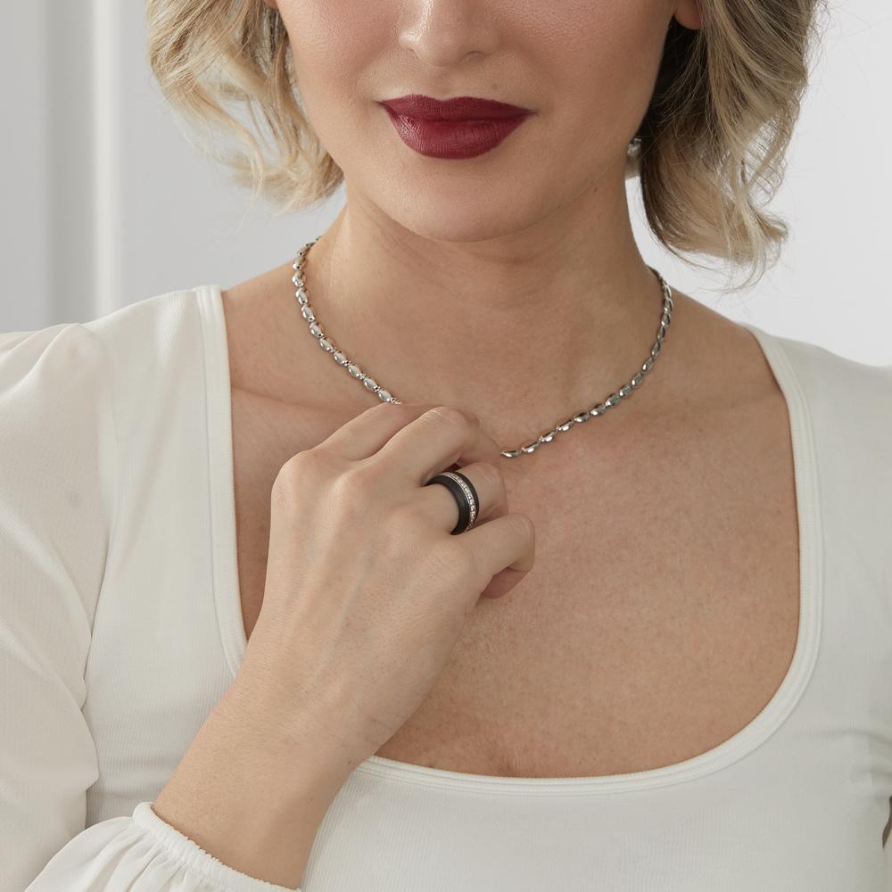 Elegantes Damen Ringset aus 750er Weißgold und Carbon. Der außergewöhnliche Ring besticht durch seine matt-schwarze Carbonoberfläche und eine funkelnde Reihe von Zirkonia-Steinen. Perfekt für moderne und stilbewusste Frauen, die edle Akzente lieben.